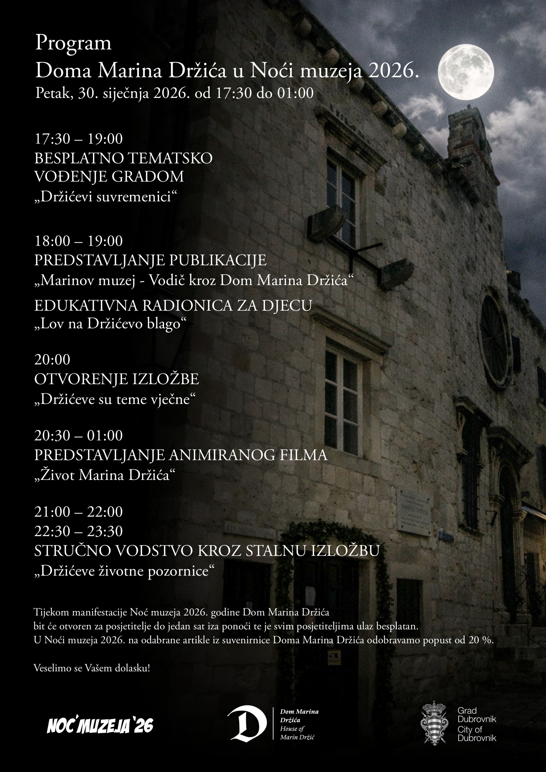 Sij 30 30.01..17:30 - 31.01..01:00 NOĆ MUZEJA 2026. U DOMU MARINA DRŽIĆA Dom Marina Držića Široka 7, DUBROVNIK Događanje Details Get Directions